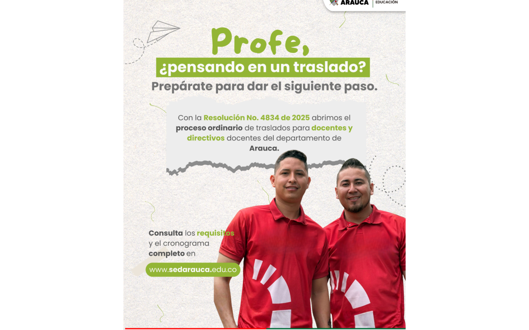Arauca, 20 de octubre de 2025. La Gobernación de Arauca, a través de la Secretaría de Educación Departamental, informa la apertura del proceso ordinario de traslados para docentes y directivos docentes con derechos de carrera administrativa, conforme a lo dispuesto en la Resolución N.° 019806 del 30 de septiembre de 2025 del Ministerio de Educación Nacional y la Resolución N.° 4834 de 2025, expedida por la Secretaría de Educación Departamental.