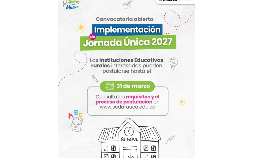 Arauca, 05 de marzo 2026. En el marco de la Estrategia de Resignificación del Tiempo Escolar, la Secretaría de Educación Departamental de Arauca convoca a los directivos docentes de los establecimientos educativos oficiales de la zona rural del departamento a participar en el proceso de postulación voluntaria para el ingreso y crecimiento en la Jornada Única, con implementación prevista a partir de enero de 2027.