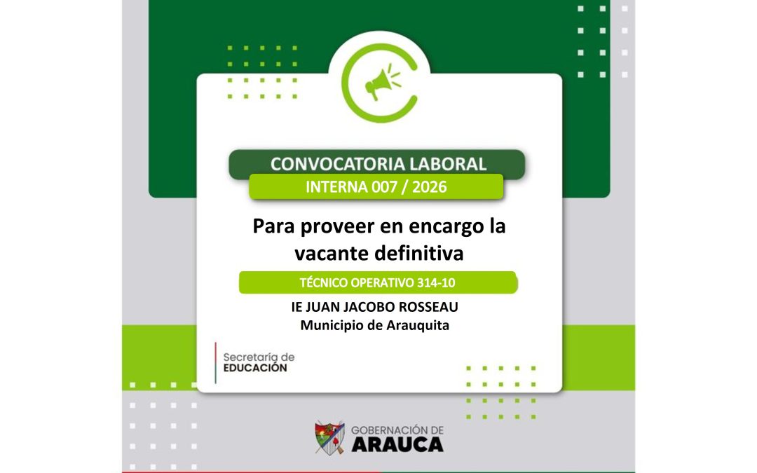 La Secretaría de Educación departamental de la conformidad con el artículo 1° de la Ley 1960 de 2019, Ley 909 de 2004, informa a los servidores públicos (administrativos) de los Establecimientos Educativos del Departamento de Arauca, Financiada con Recursos del Sistema General del Participaciones – Educación y Gobernación de Arauca o que hayan superado el Periodo de Prueba en forma satisfactoria que se encuentren interesados en ocupar por encargo en vacancia definitiva el Empleo de Técnico Operativo Código 314, Grado 10, de la PLANTA DE CARGOS DE LA SECRETARÍA DE EDUCACIÓN DEPARTAMENTAL DE ARAUCA, IE JUAN JACOBO ROUSSEAU DE ARAUQUITA, DEL SISTEMA GENERAL DE PARTICIPACIONES – EDUCACIÓN.
